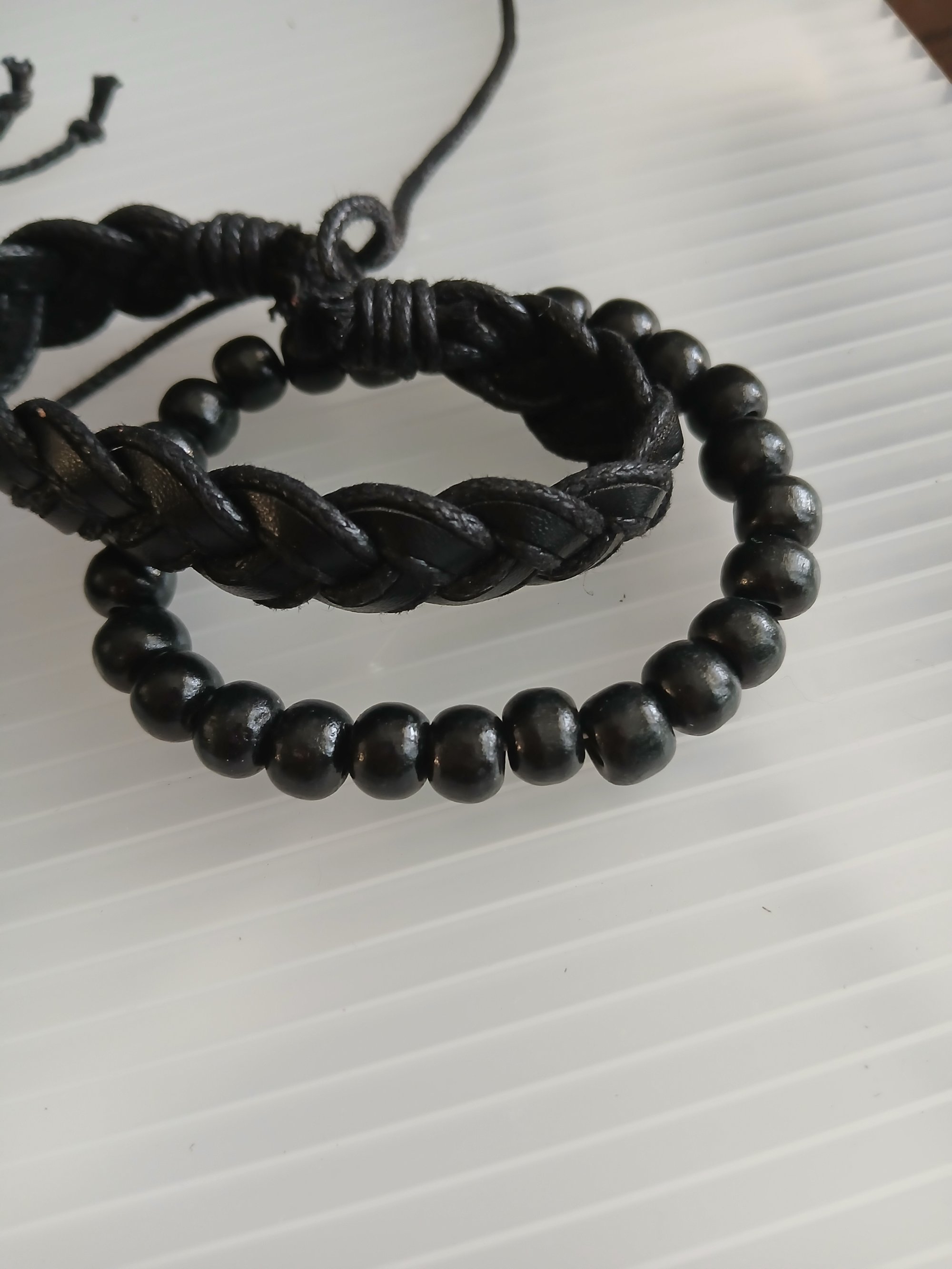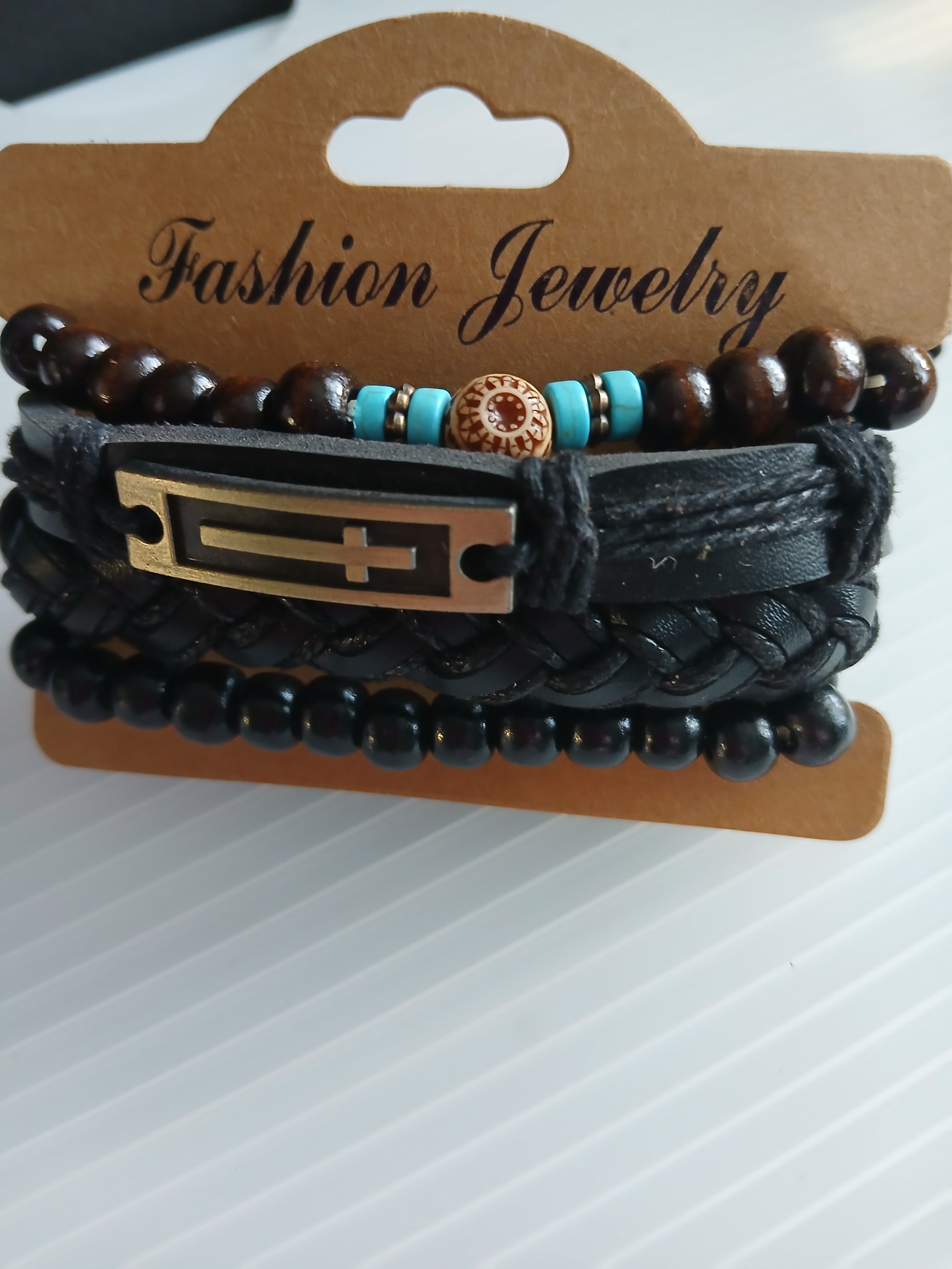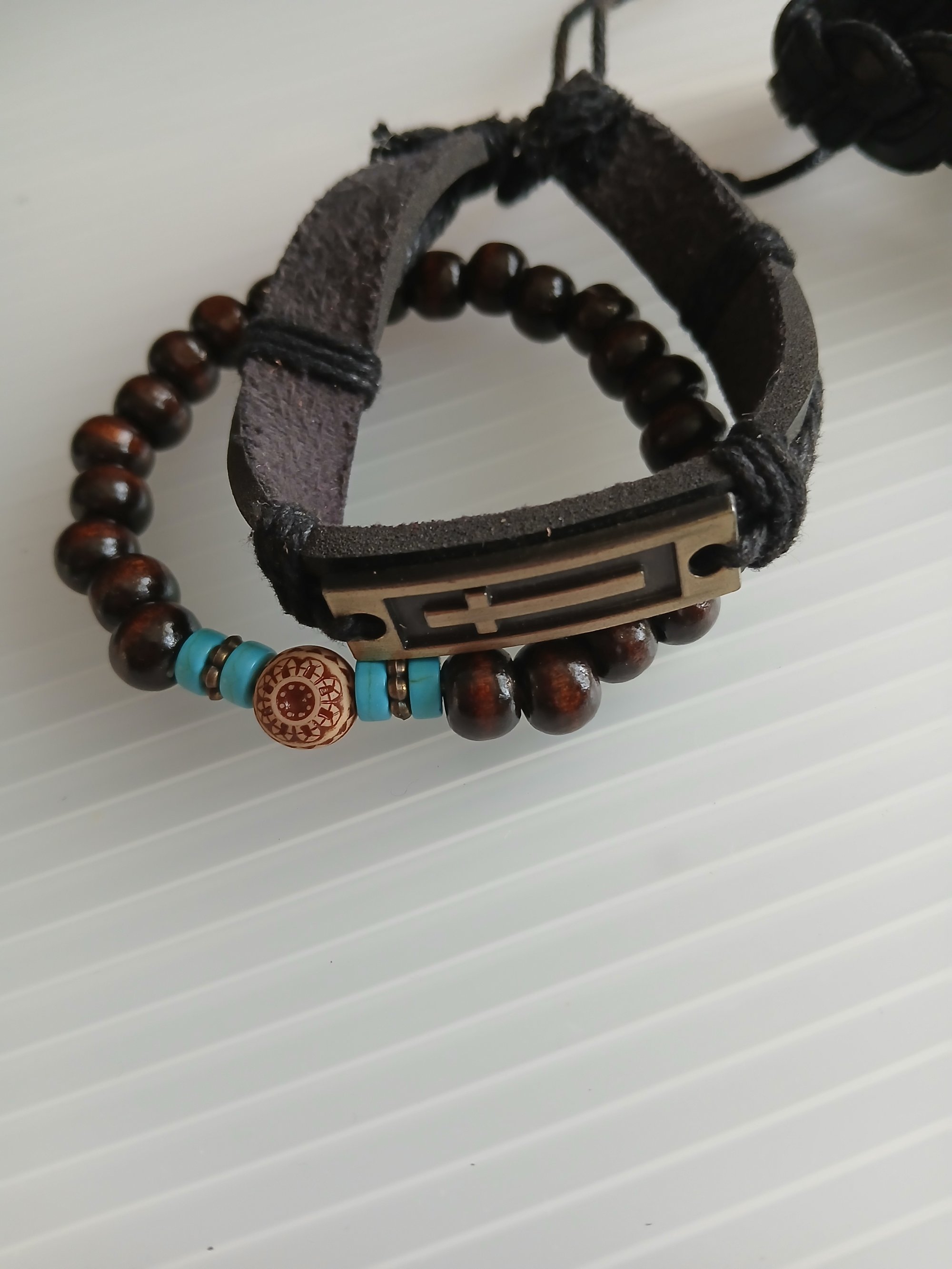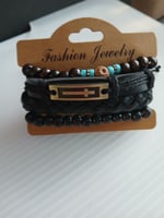 Faux leather wrapped adjustable bracelets with metal cross charm and polished wood bead stretch bracelets. Four piece bundle. One size fits most men and women. Casual wear.