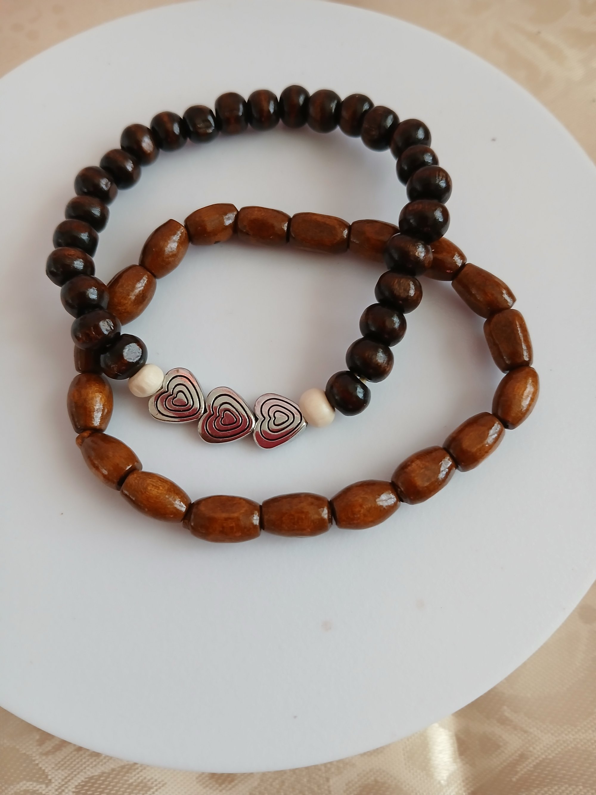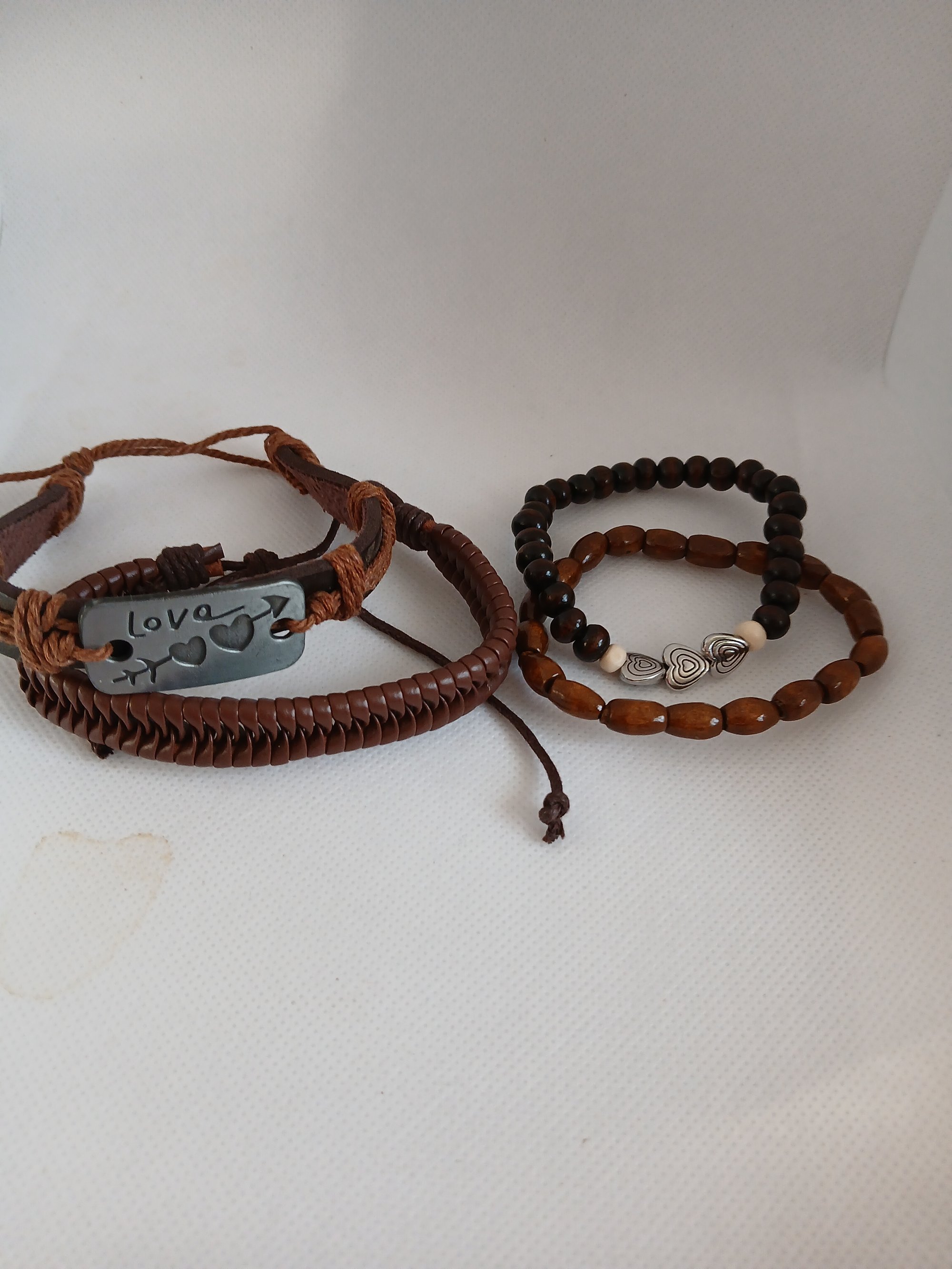 Four piece faux leather and wooden bead bracelet set. Love charm adorns leather wrap bracelet. Heart beads on another wooden beaded bracelet. Dark polished wooden beads on a third bracelet and a fourth bracelet with woven faux leather strands. Beaded bracelets are stretch. Faux leather bracelets are adjustable to fit sizes 6"-9"