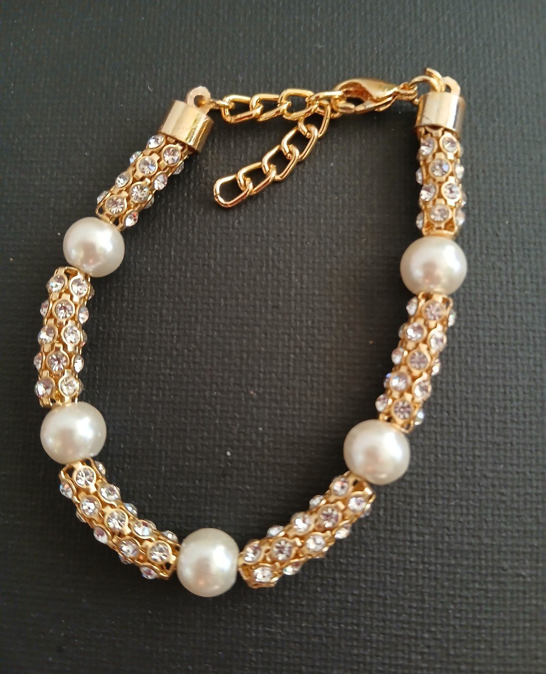Beautuful bracelet with sparkle. Goldtone with rhinestone spacer beads as the make up of the bracelet with faux pearl beads as the accent on a goldtone wire. This is a 6" wire bracelet excluding the clasp and extender chain. With the clasp and the extender chain the bracelet will extend to 8". Will fit a 6-7" wrist comfortably. All sales are final. No return or exchange after 7 days. If you must return item it should be in the original packaging unopened.